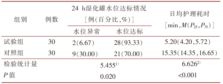 目的 设计呼吸机湿化罐自动补液装置,弥补传统滴注法的不足,并评价其在机械通气患者中的应用效果。方法 呼吸机湿化罐自动补液装置由非接触式电容传感器、控制器、固定器和电源等组成。装置采用常闭式电磁阀,通过电磁继电器与传感器连接并接收液位信号,控制输液器的开启和闭合。2024年7月—10月,便利选取泉州市某三级甲等医院重症医学科收治的机械通气患者60例,采用随机数字表法分为试验组和对照组各30例。试验组采用自动补液装置辅助添加湿化液,对照组采用输液器持续滴注法添加湿化液。评价两组湿化罐水位达标率、日均护理耗时、痰液黏稠度;收集护士的操作反馈。结果 试验组湿化罐水位达标率高于对照组,日均护理耗时低于对照组,差异有统计学意义(均P<0.05);试验组痰液黏稠度优于对照组,但广义估计方程结果显示,两组患者不同时间点痰液黏稠度差异的组间效应、时间效应、交互效应均不具有统计学意义(P>0.05)。护士对装置的认可度为96.65%。结论 使用呼吸机湿化罐自动补液装置,实现了湿化液的自动补充,提高了湿化罐水位达标率;有利于减少护理耗时,可在一定程度上减轻护理工作负担;护士认可度高,具有较好的创新性与应用价值。试验组痰液黏稠度虽优于对照组,但差异无统计学意义(P>0.05),提示湿化效果可能受多因素影响,需进一步验证。