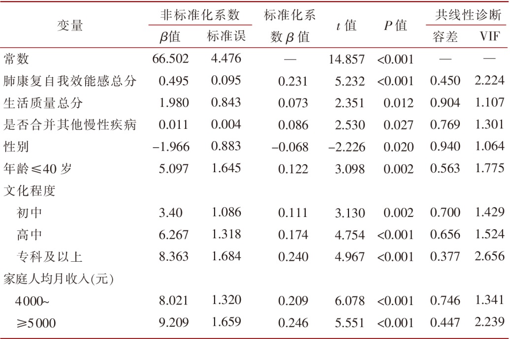 Objective To analyze the current status and influencing factors of self-management ability of pulmonary rehabilitation training in patients after mechanical heart valve replacement surgery,and provide reference for the development of effective pulmonary rehabilitation intervention plans. Methods Through convenience sampling,201 eligible patients who underwent mechanical heart valve replacement surgery at a tertiary hospital in Yunnan Province from November 2023 to March 2024 were selected as the study subjects. A comprehensive survey was conducted on patients using a general information questionnaire,a self-management scale for patients after mechanical heart valve replacement surgery,a pulmonary rehabilitation self-efficacy index scale,and a concise quality of life scale. Through multiple stepwise regression analysis,factors affecting the self-management ability of lung rehabilitation training in patients after mechanical heart valve replacement surgery were identified. Results Multiple stepwise regression analysis showed that gender,age,average monthly household income,educational level,presence of other chronic diseases,self-efficacy in pulmonary rehabilitation,and quality of life were the main influencing factors on the self-management ability of pulmonary rehabilitation training in patients after cardiac mechanical valve replacement surgery. Conclusion The self-management ability of pulmonary rehabilitation training for patients undergoing mechanical heart valve replacement surgery urgently needs to be improved,and is influenced by many factors. Medical staff should take various measures to improve the self-management ability of patients undergoing mechanical heart valve replacement surgery,thereby enhancing self-efficacy and improving quality of life,providing scientific basis for reducing the occurrence of postoperative pulmonary complications.