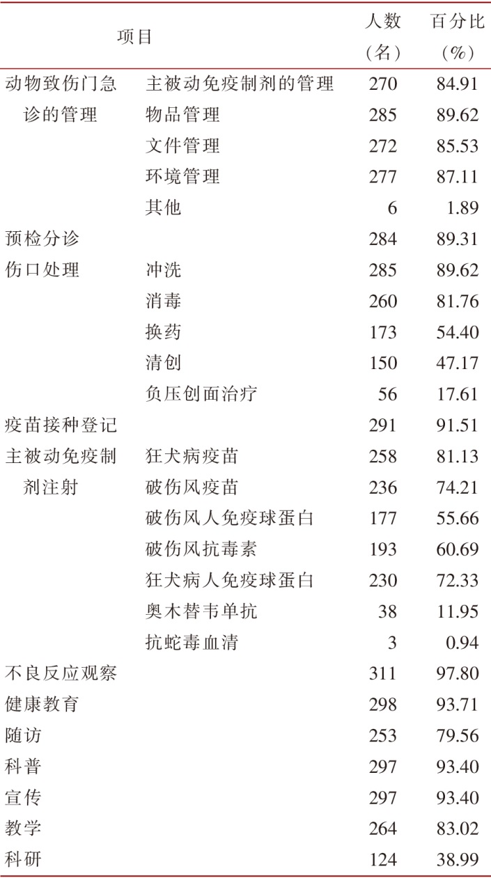 Objective To understand the current status of the setting and nursing work in animal injury clinic and emergency department in China,so as to promote the development of the discipline of nursing. Methods A questionnaire was developed through literature review and expert consultation. The questionnaire included basic information and the setting in animal injury clinic,nursing work content and vaccination. Using convenience sampling method,a survey will be conducted from November to December 2023 on nursing staff engaged in animal injury work nationwide. Results A total of 318 valid questionnaires were collected,covering 123 medical institutions in 69 regions of 23 provinces. The results showed that different medical institutions had different names for "animal injury clinic",and the work contents included management of animal injury clinic,triage,wound management,active and passive immune preparation injection,adverse reaction observation,health education,follow-up,science popularization,teaching and scientific research,etc. The main problems encountered by nurses in the work included insufficient knowledge/ability of wound management,insufficient understanding/cooperation of patients,unclear post management,insufficient staffing,and doctor-nurse collaboration to be strengthened. There were many differences in the vaccination of animal injury clinics,including the selection of skin disinfectant during vaccination,the selection of syringe,the site of vaccination,and the rewarming of the vaccine before vaccination. Conclusion There are differences in the settings of hospital animal-induced injury clinic(emergency) departments,the contents of nursing work,and the details of vaccination operations in 23 provinces of our country. A professional academic platform and team should be established to standardize the name of animal injury clinic and the training contents,frequency and assessment of nursing staff,formulate industry standards to standardize vaccination and management. And clear job responsibilities,work content,work flow and operating standards should be formulated,communication and collaboration between doctors and nurses should be strengthened,and the training of nurses’ scientific research ability should be enhanced to promote the continuous development of animal injury nursing.